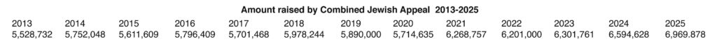 As far as emergency relief for Israel goes, while there was still over $121,000 collected for that purpose in the 2024-2025 fiscal year, it should be noted that the amount raised for emergency relief for Israel in 2023-24 was an astounding $4,421, 468.