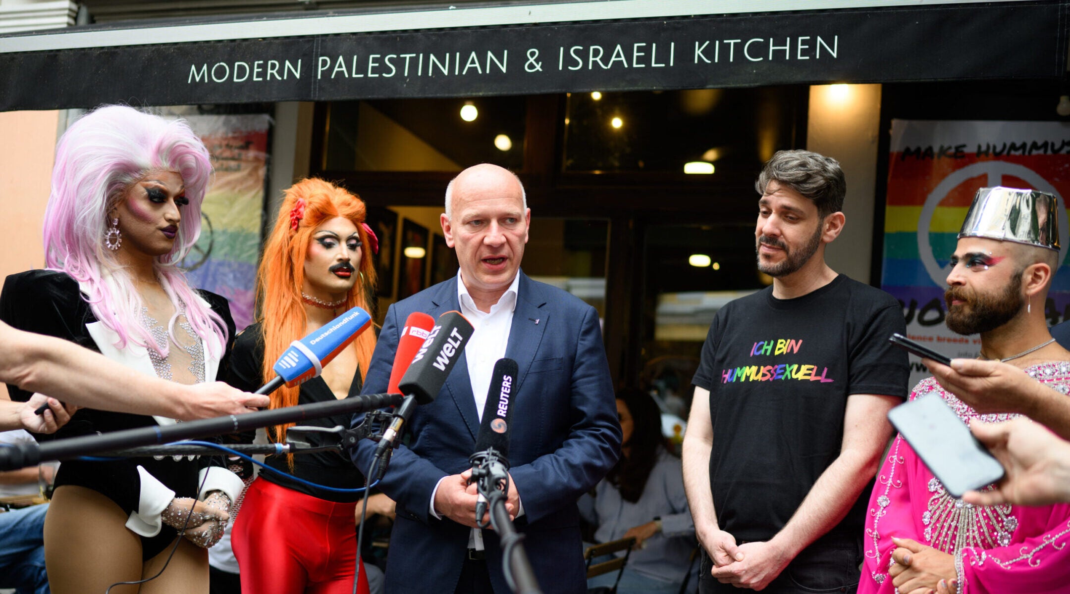 Berlin Mayor Kai Wegner visits Kanaan following a break-in and vandalism at the Israeli-Palestinian restaurant, July 26, 2024. (Bernd von Jutrczenka/picture alliance via Getty Images)