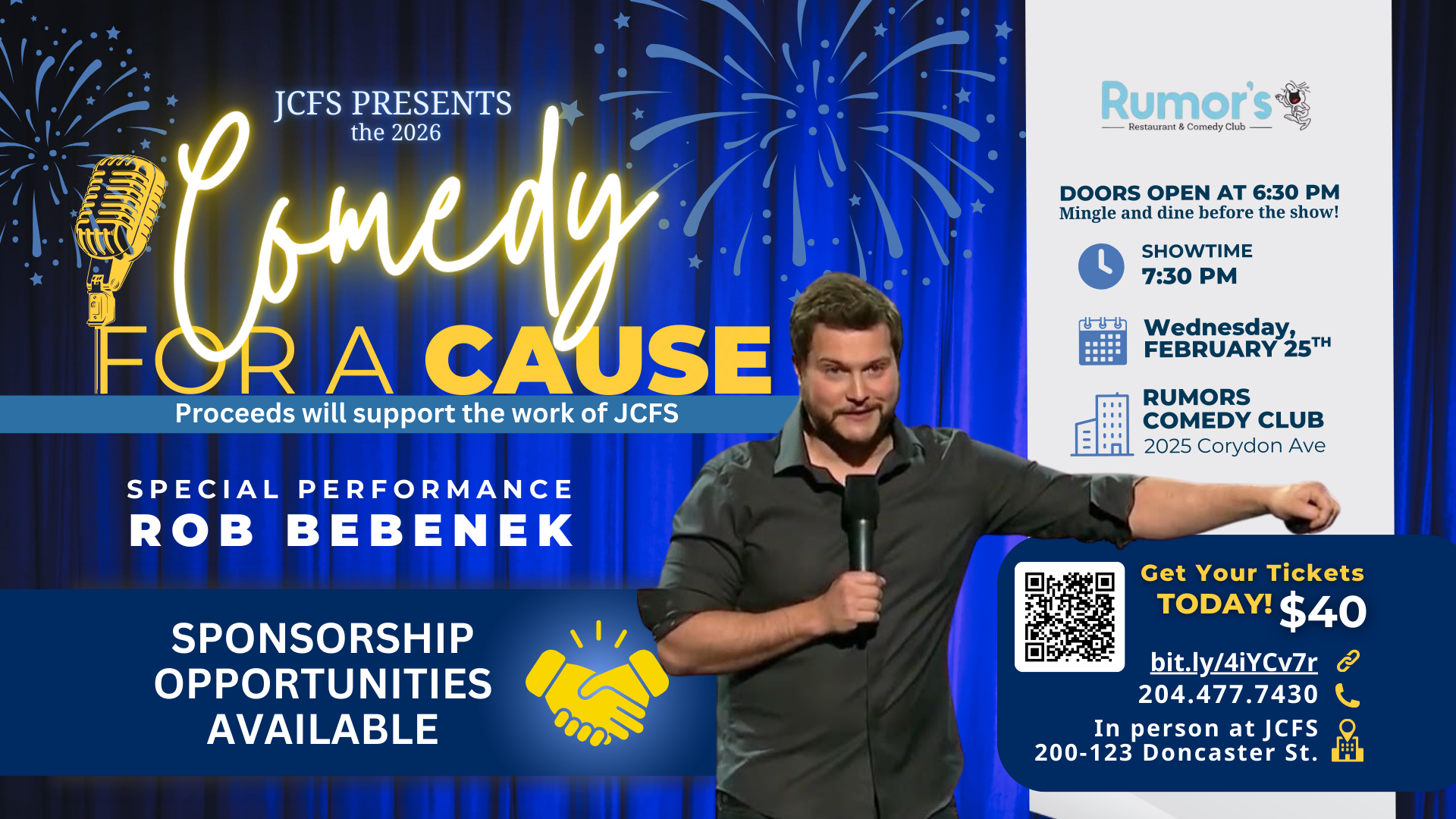 Tickets for the show cost $40 and are available to purchase by calling JCFS (204-477-7430) or by visiting here: https://www.zeffy.com/en-CA/ticketing/jcfs-comedy-for-a-cause. Sponsorships are still available.