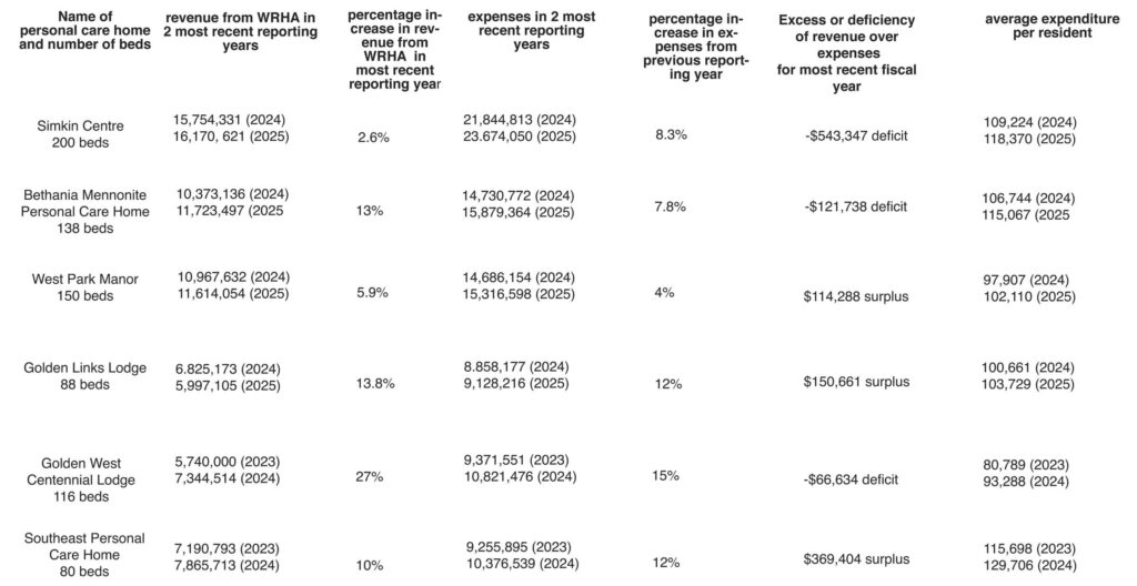 I also looked at financial statements for six different not-for-profit PCHs in Winnipeg. (Financial statements for some, but not all PCHs, are available to look at on the Province of Manitoba website. Some of those financial statements are for 2025 while others are for 2024. Still, looking at them together provides a good idea how comparable revenue and expenses are for different PCHs.)