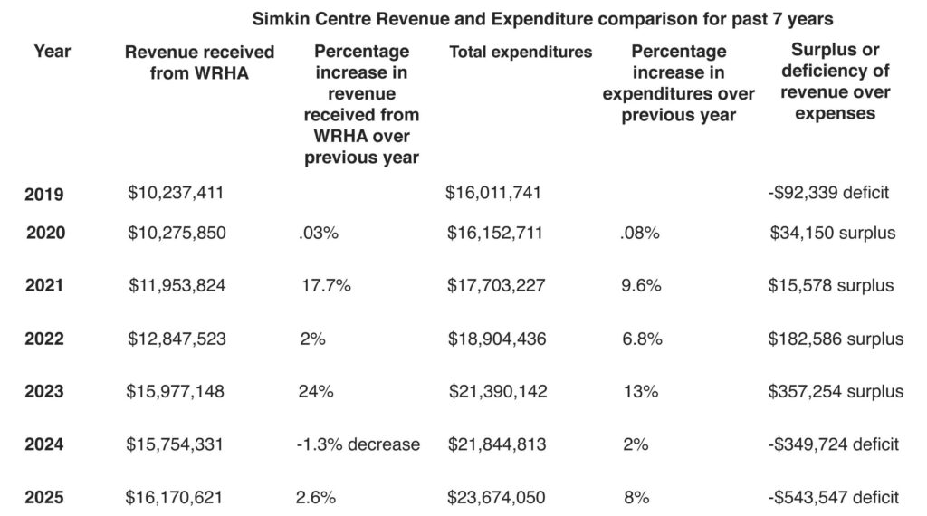 Looking through the 16 pages of the Simkin Star I noticed that three full pages were devoted to financial information about the Simkin Centre, including the financial statement for the most recent fiscal year (which ended March 31, 2025). I was rather shocked to see that Simkin had posted a deficit of $406,974 in 2025, and this was on top of a deficit of $316,964 in 2024.
