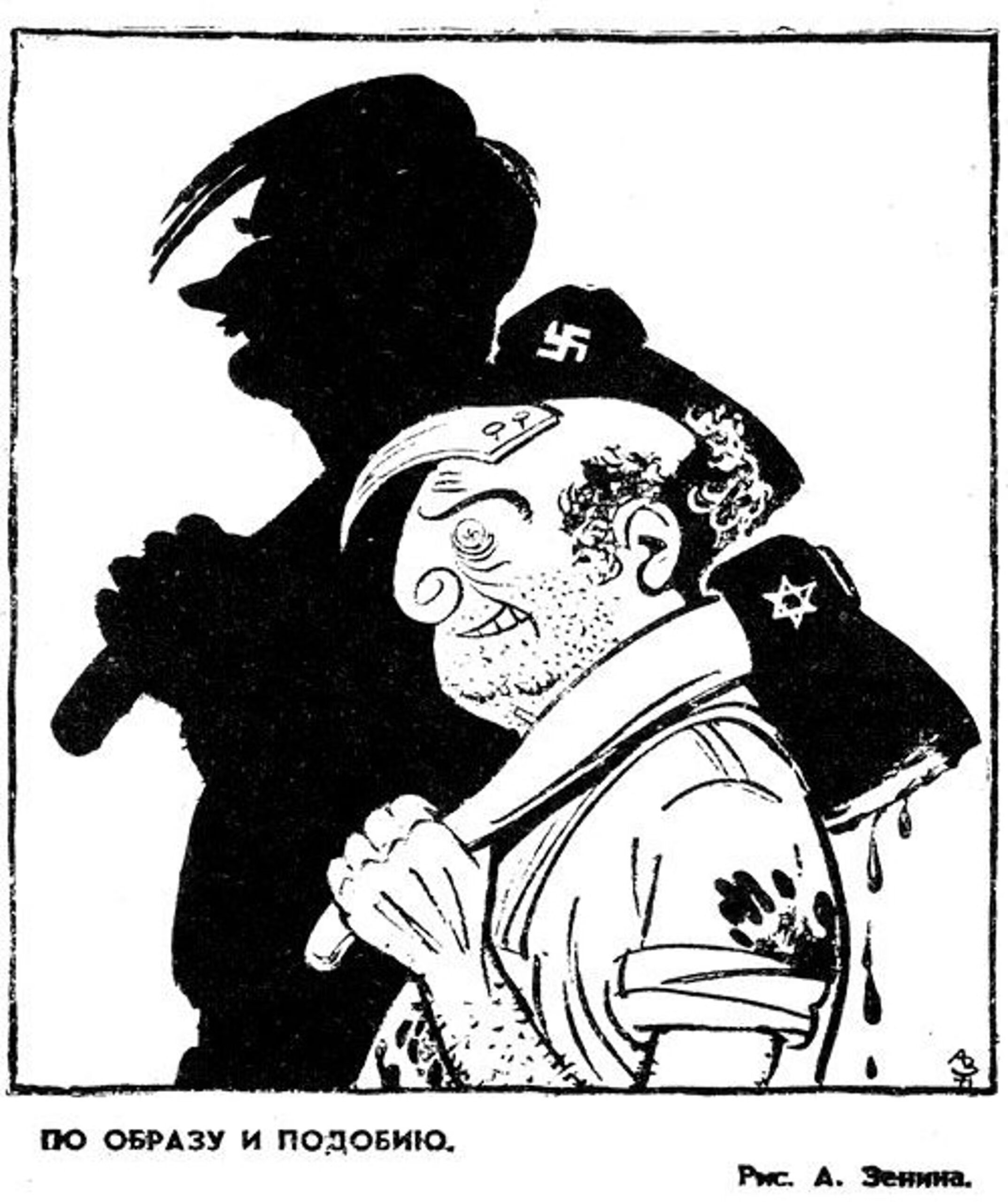 In political cartoons and Soviet propaganda art, swastikas were routinely intertwined with Stars of David, and the Israeli military portrayed as resembling Nazi — and specifically SS — troops. If there is a Soviet propaganda subtext that highlights its ideological and propagandistic roots, it would be “Fascism Under a Blue Star,” the 1971 book by Evgeny Evseev, who had served as an Arabic interpreter for both Soviet leaders Nikita Khrushchev and Leonid Brezhnev. By the late 1970s, he had became one of the principal brains of the ultranationalist antisemitic movement in the USSR, know as the “Russian Party.”