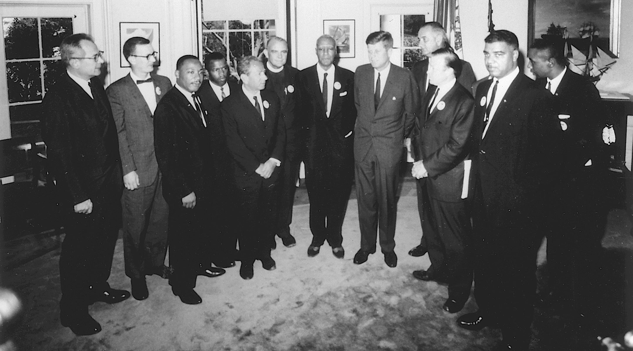 Rabbi Joachim Prinz, fourth from left in front row, joins leaders of the March on Washington, including Martin Luther King Jr. (third from left), at an Oval Office meeting with President John F. Kennedy, Aug. 28, 1963. (U.S. National Archives and Records Administration)