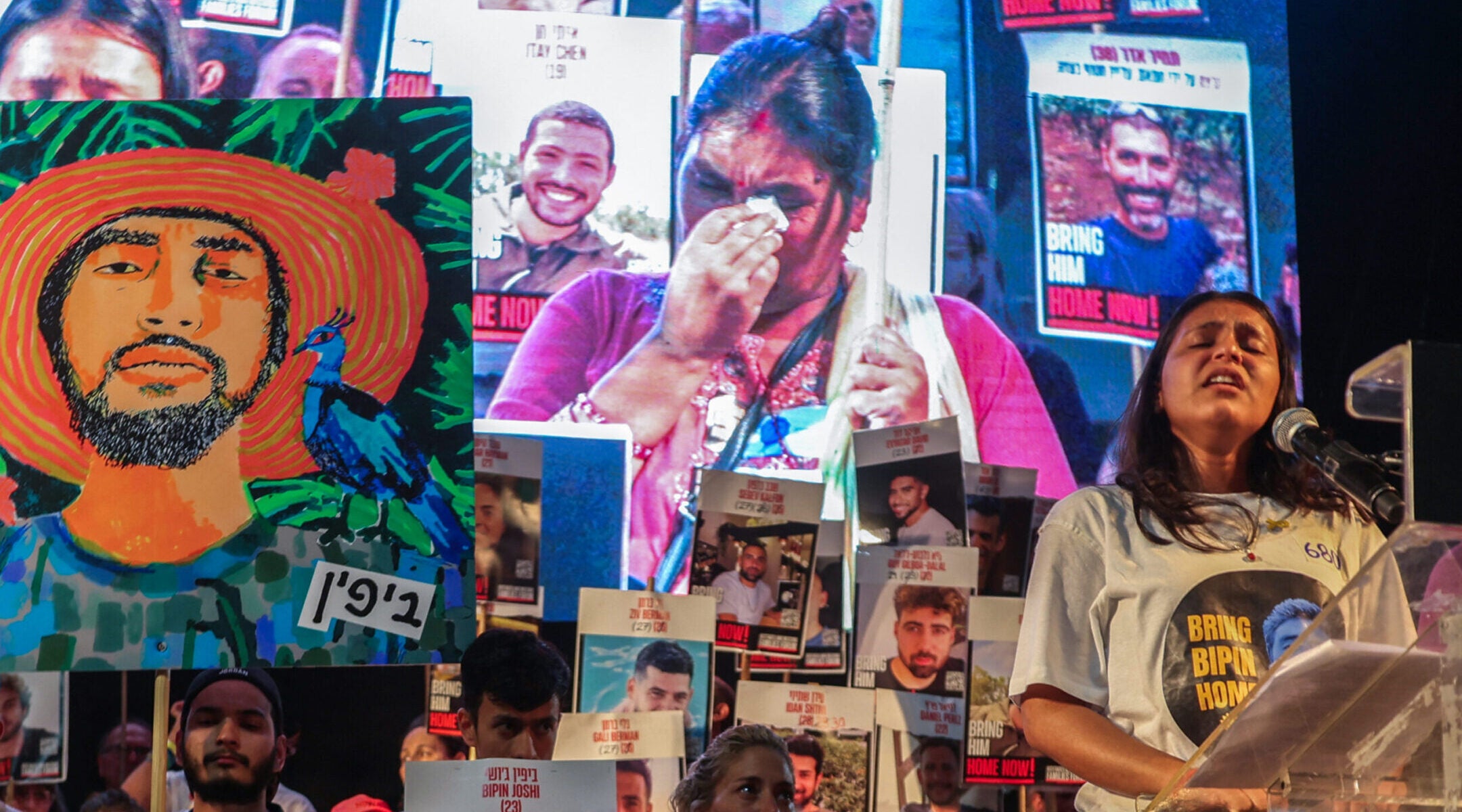 Padma (screen) and Pushpa (podium) Joshi, the mother and sister of Nepalese national Bipin Joshi held hostage by Palestinian militants in Gaza since 2023, address a demonstration organized by the families of hostages calling for action to secure their release in Tel Aviv on Aug. 16, 2025. (Jack Guez/AFP via Getty Images)