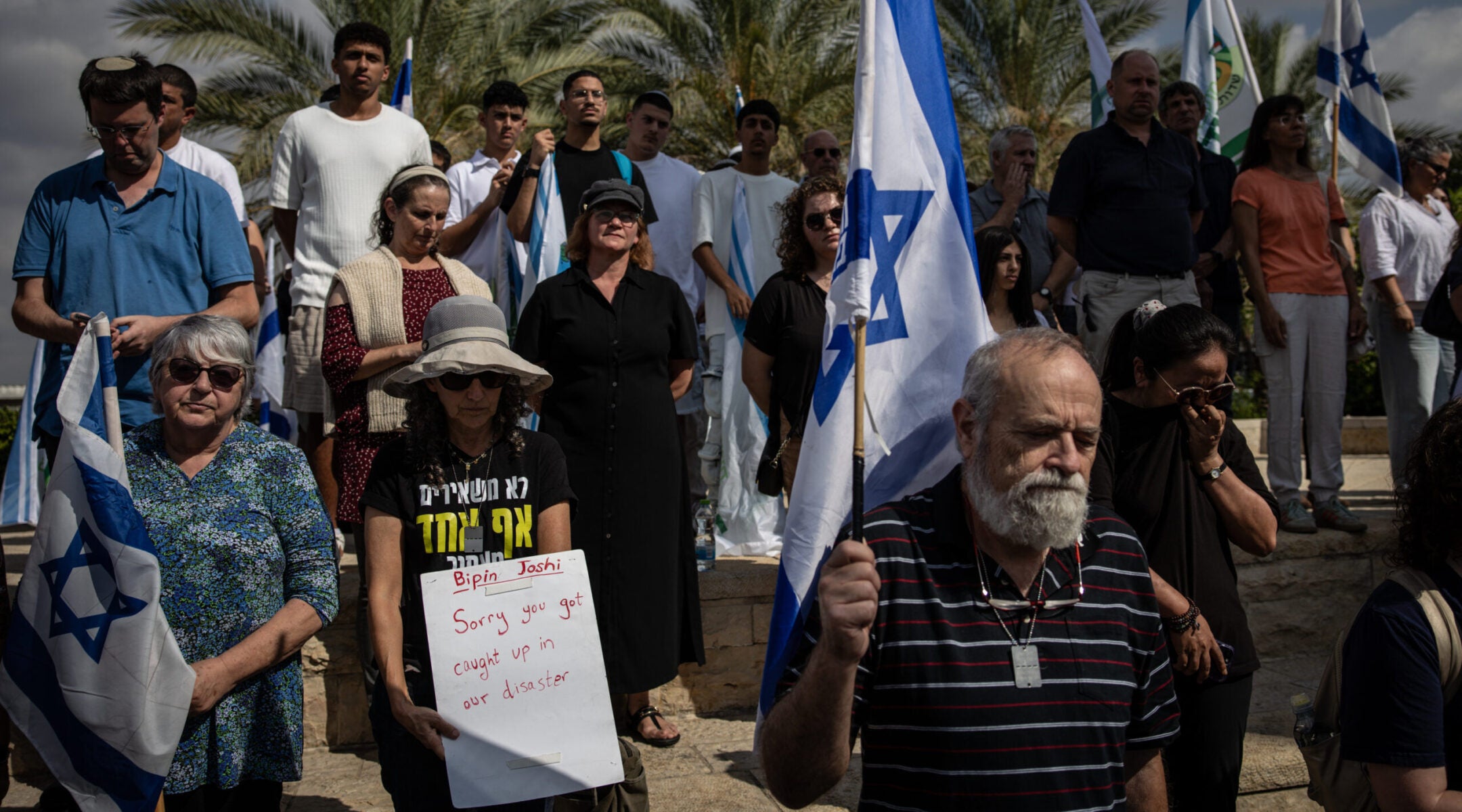 Israelis attend a farewell ceremony for Bipin Joshi at Ben Gurion Airport on Oct. 19, 2025. One holds a sign that says, “Sorry you got caught up in our disaster.” (Chris McGrath/Getty Images)