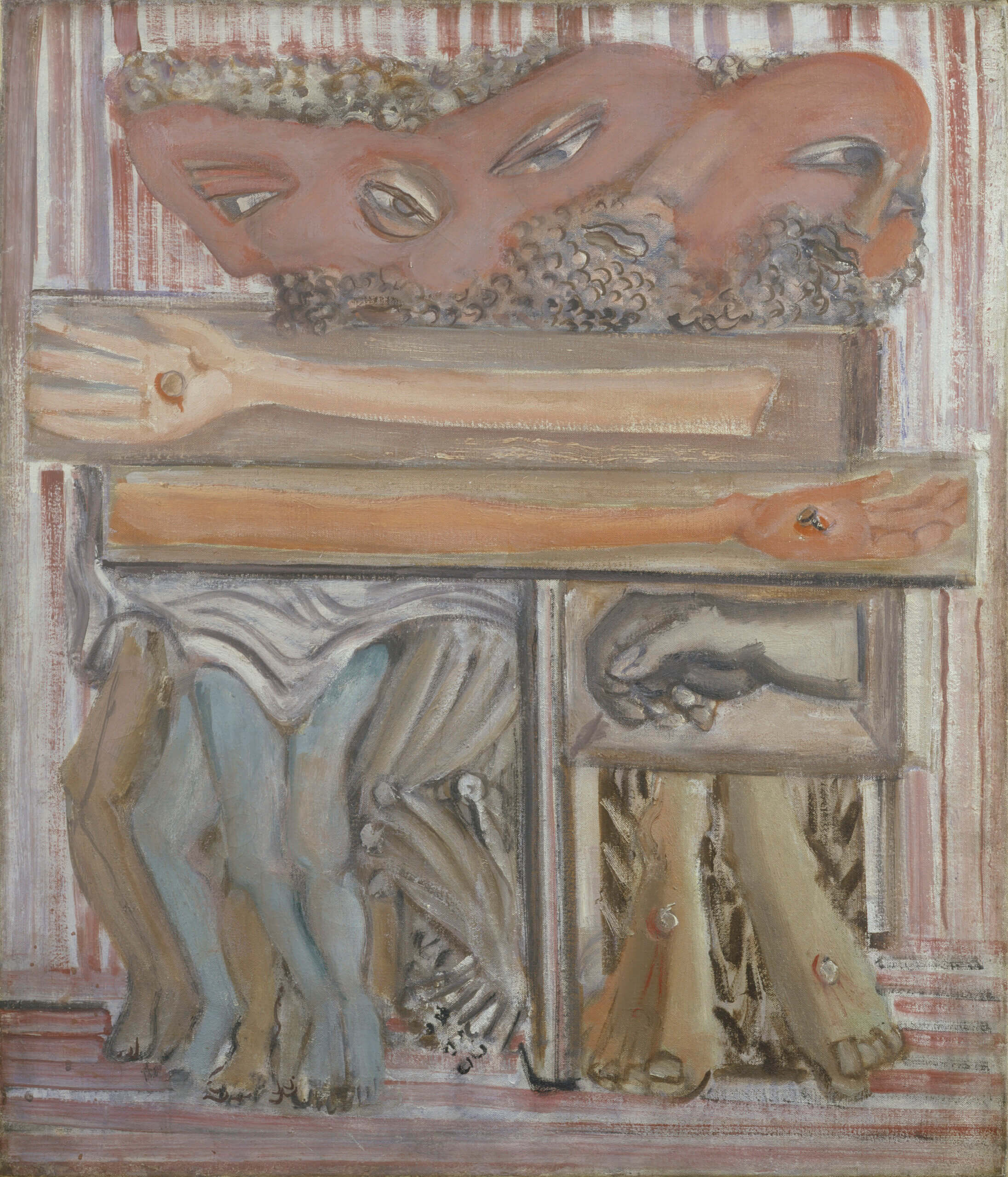 European Jews were not immune to the modernism sweeping over Europe, and used its fractured forms to comment on their people’s persecution. A late figurative drawing of severed limbs by Mark Rothko, from his crucifixion series in the early 1940s, makes a wry comment on Christian hegemony and Hitler’s campaign of annihilation. (Marc Chagall, who produced a similar series, is across the way, appearing to pee on his native Vitebsk, which he left for Paris.)