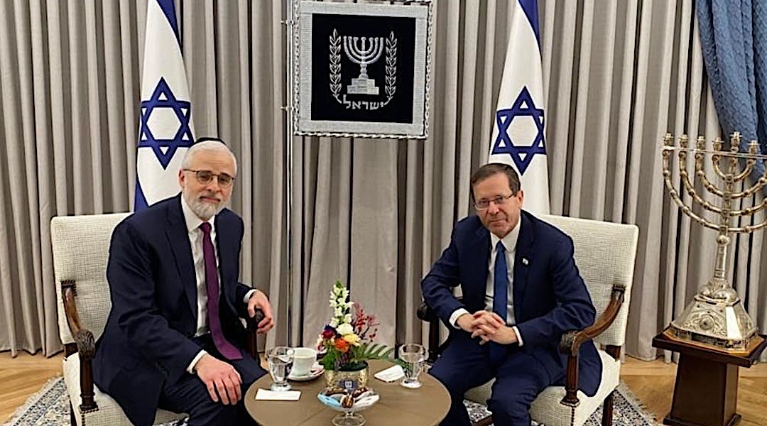 Rabbi Moshe Hauer, left, meets with Israeli President Isaac Herzog at Herzog’s official residence in Jerusalem, Jan. 22, 2025. (Orthodox Union)