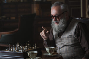 The film, directed by Leon Prudovsky, opens in 1934; title cards tell us, vaguely, that we are in Eastern Europe, but savvy audiences will be able to recognize it is Poland from the language. There, our protagonist, Marek Polsky (David Hayman), is a champion chess player with a big loving family. Then, the film flashes forward to 1960; now, he lives alone in South America — exactly where is unclear — the sole survivor of his family.