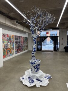 In the center of the gallery stands a giant tree that Peretz explained was sculpted out of the body bags ZAKA used to collect human remains. References to ZAKA appear throughout the exhibit. In a small side room, a video created by one of the residents is played, which shows ZAKA volunteers sitting in the ruins of the kibbutzim in Israel that were ravaged by the Oct. 7 attacks. The volunteers were instructed to sit in silence for an hour and stare into the camera, resulting in a deeply unsettling film that felt almost too intimate to watch.