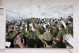 Upon entering the 8 Project gallery in downtown Manhattan, the first painting one is greeted with is Peretz’s own, a group of Israeli soldiers huddled together, accompanied by the spirits of their fallen comrades represented by icy-white hands painted on the heads of the living. In a city where torn-down hostage posters became almost a fixture of the streets during the Gaza war, the gallery feels both out of place and deeply intentional.