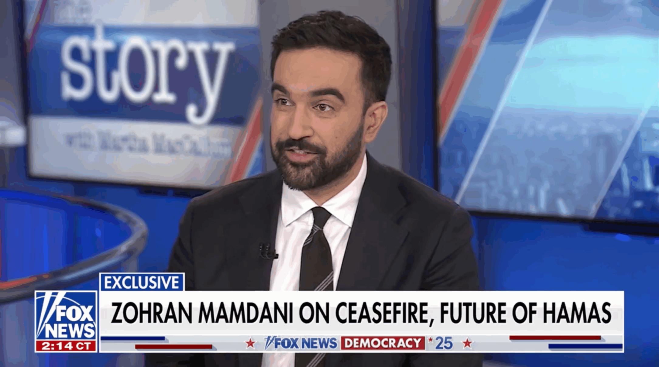 Anchor Martha MacCallum repeatedly raised the Middle East, asking Mamdani, “Do you believe that Hamas should lay down their weapons and leave the leadership in Gaza?”