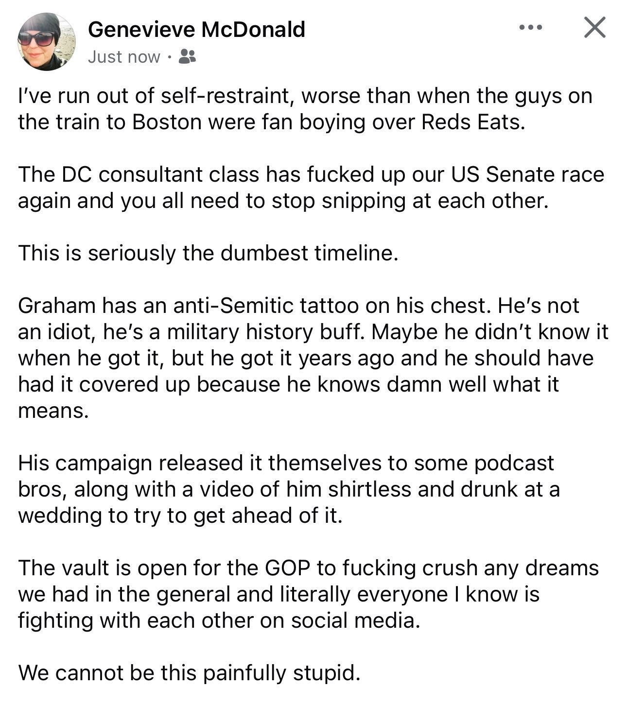 However, his former political director, Genevieve McDonald, who resigned from his campaign last week, wrote in a Facebook post that she thought the candidate knew about the “antisemitic tattoo on his chest” before rumors began. “Maybe he didn’t know it when he got it,” she added, “but he got it years ago and he should have had it covered up because he knows damn well what it means.”