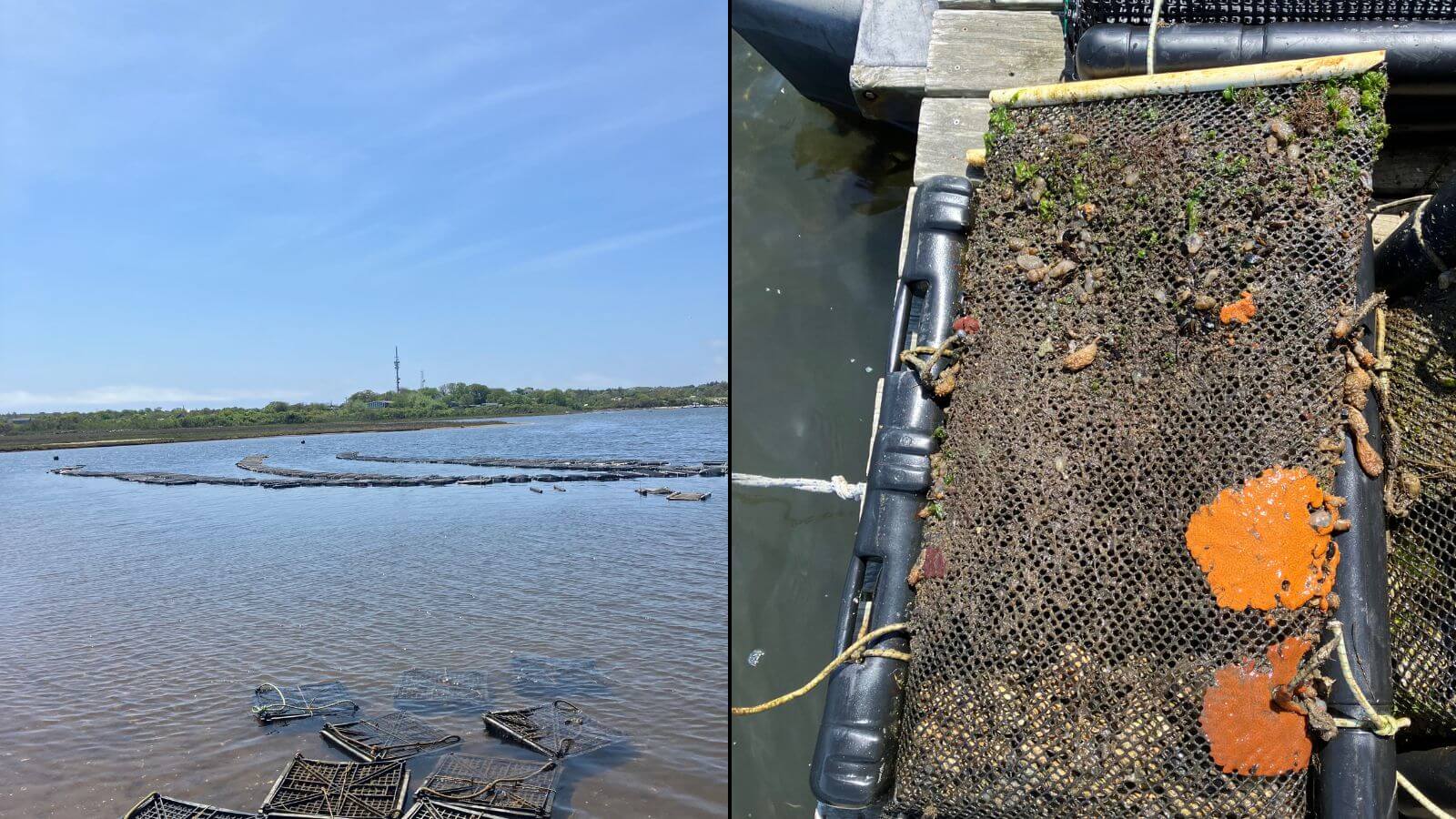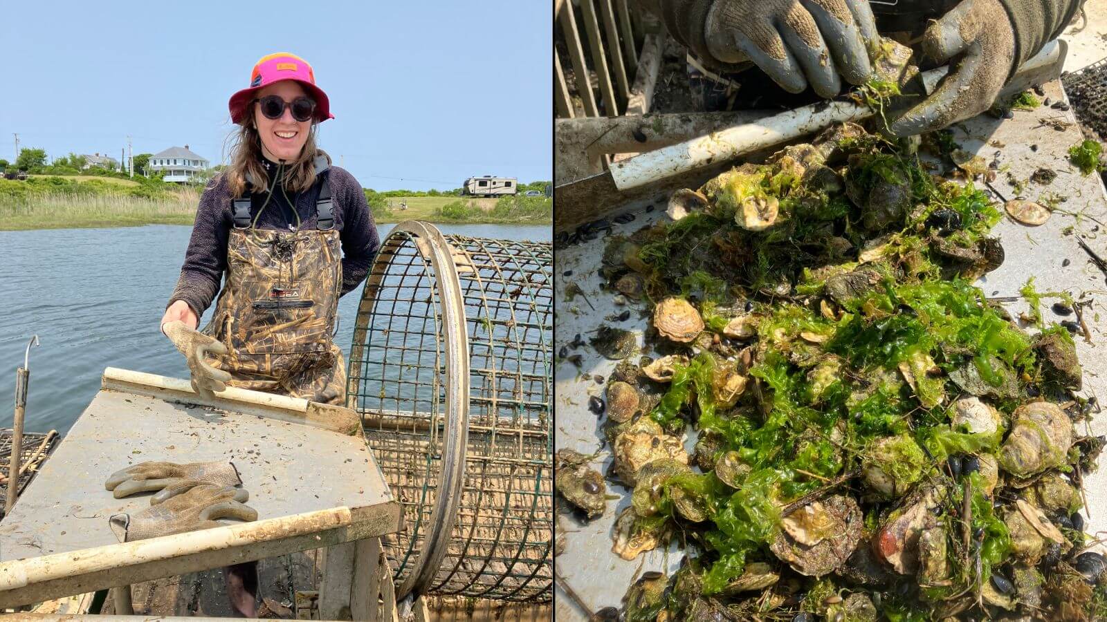 If you are, like most people, unfamiliar with the mechanics of oyster farming, here’s what it looks like, at least on this farm. First, you toot around a saltwater pond in a glorified bathtub with a motor hanging off the back. From the boat, wearing chest waders, you hop in the water to unmoor dozens of giant floating mesh bags full of oysters from lines anchored in the pond. The bags are usually also bogged down with a mess of extraneous sea dwellers like kelp, mussels, green crabs and goopy creatures called sea squirts, so they’re heavy. You pile as many bags as you can into the boat, clamber back in — which is harder than it sounds, because your wader boots are probably stuck in the mud at the bottom of the pond — and bring those bags to a floating barge.